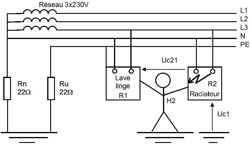 Si le récepteur R2 se trouve dans une pièce d’habitation (UL= 50V), H2 est-il en danger ou non ?