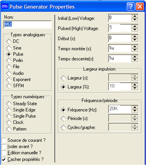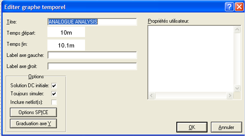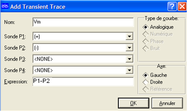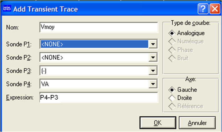- Placer deux sondes de tension aux bornes du moteur (+) et (-) et une sonde de tension entre la résistance R2 et la capacité C1 du filtre que vous nommerez VA Ouvrir un graphe analogique et insérer des relations pour cela : - "Clic droit" sur la partie verte du graphe - Puis "Clic droit" sur l'icône insertion manuelle de courbes une fenêtre s'ouvre que vous complétez comme suit:
