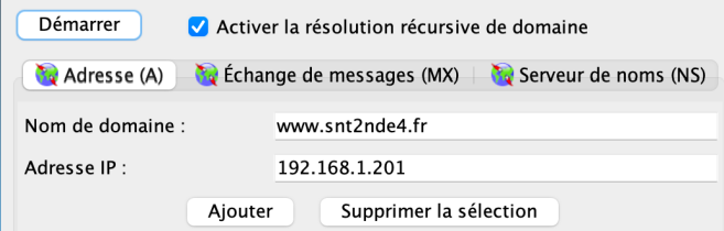 Choisir un nom de domaine (par exemple www.snt2nde8.fr) et indiquer l'adresse IP du serveur web (192.168.1.201