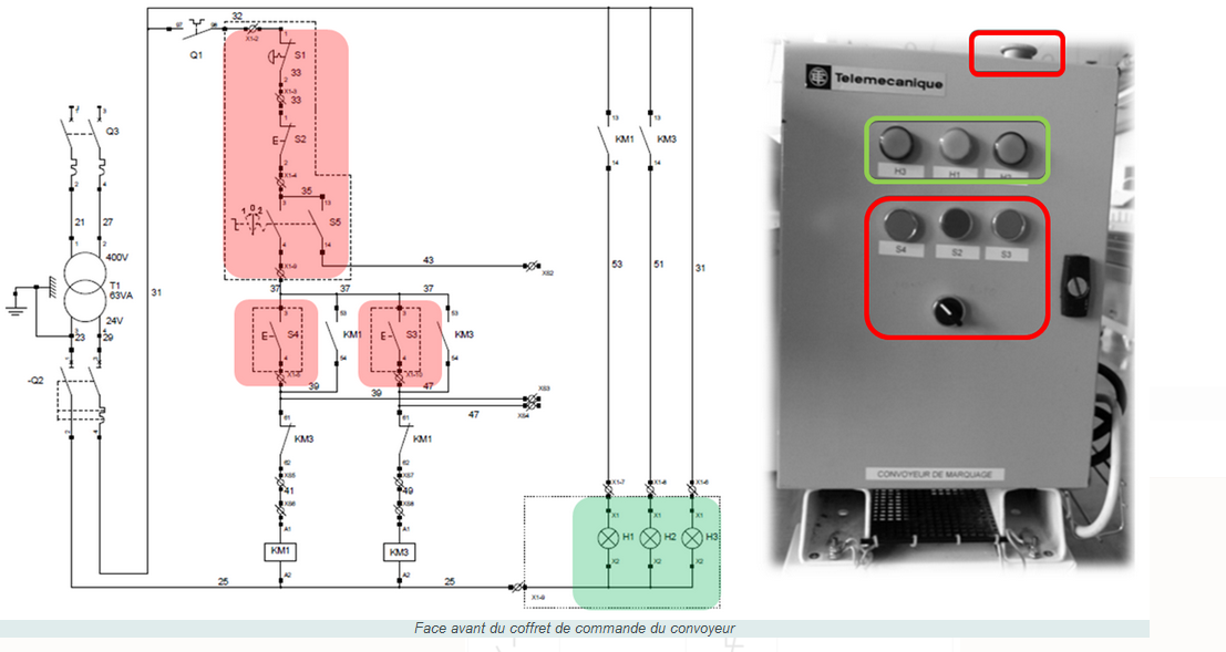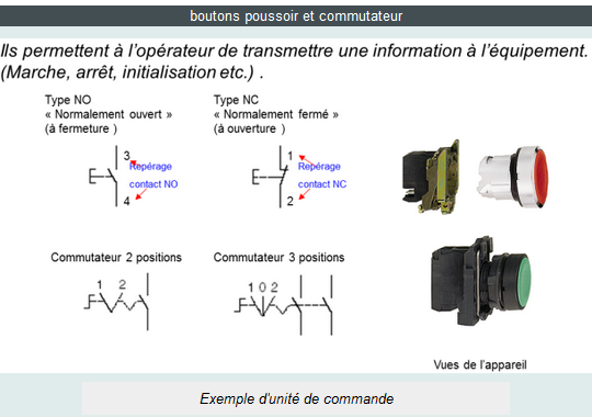 Le déclenchement d'une action par l'opérateur s’effectue à partir d'unité de commande, boutons poussoir et commutateur (Encadrer en rouge)