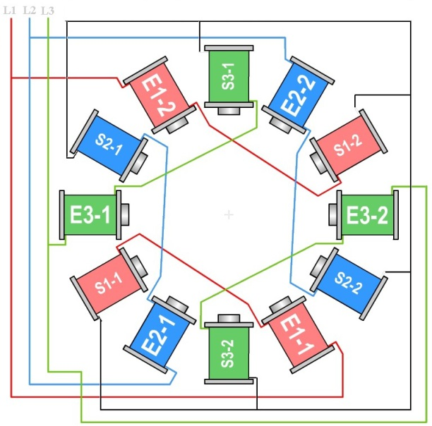 Une bobine par phase et par pôle. Un moteur constitué de deux pôles magnétiques aura 6 bobines (3 phases x 2 pôles)