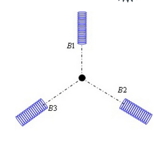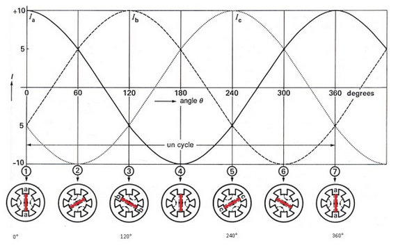 Imaginons maintenant trois enroulements identiques, espacés de 120° entre eux et qui sont alimentés chacun par une phase d'un réseau triphasé et équilibré. Chaque phase associée à un enroulement fait partie d'un ensemble triphasé de tensions qui "tourne" à 50 Hz. Ces trois phases ensemble créent alors un champ magnétique bipolaire ( 2 pôles, un nord et un sud) qui tourne aussi à 50 Hz.