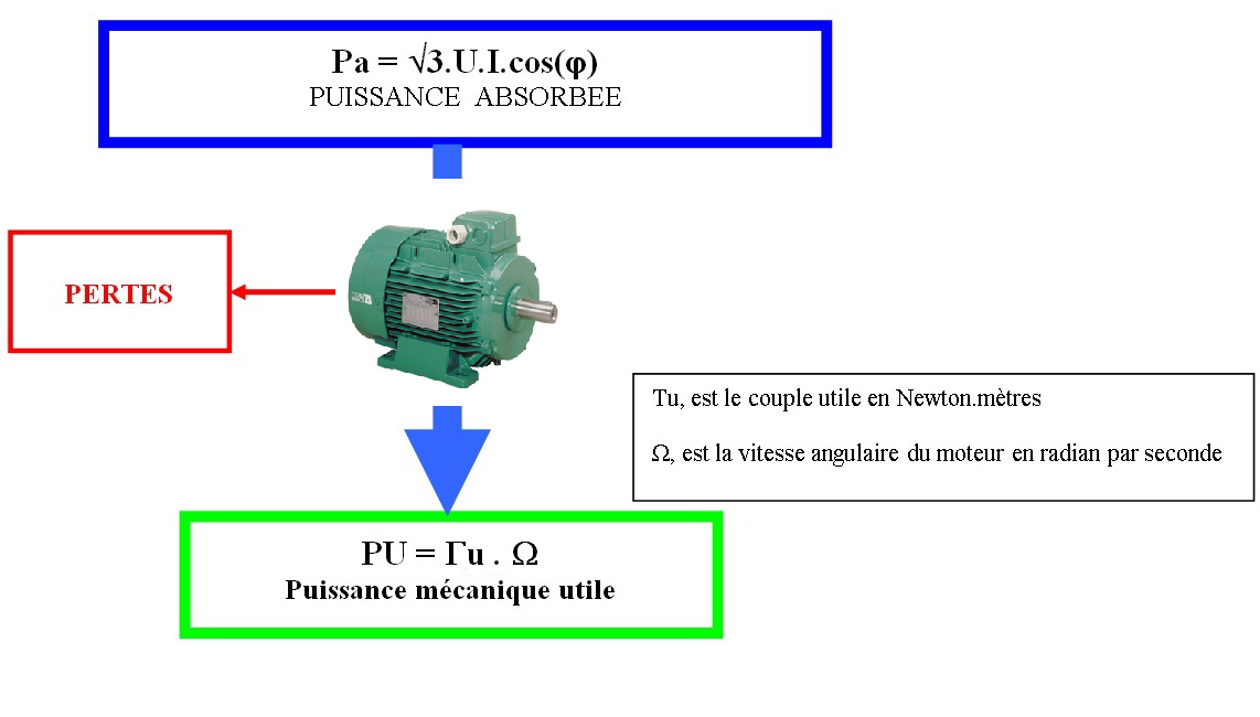 Un moteur absorbe une puissance électrique "Pa" et la transforme en puissance mécanique utile "Pu".