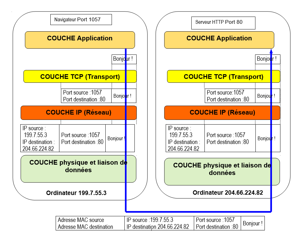 Les informations de IP vont permettre d'acheminer le paquet à destination du bon ordinateur. Une fois arrivé à l'ordinateur en question, la couche TCP va délivrer le paquet au bon logiciel (ici: au serveur HTTP).
