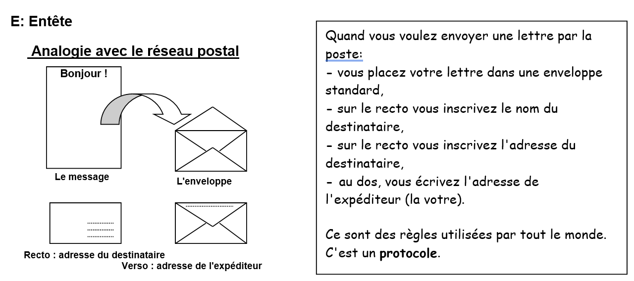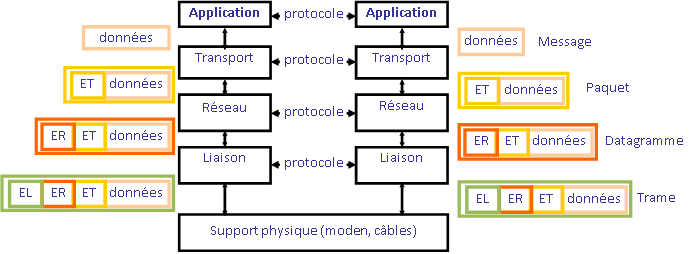 Pour traverser ces couches les données subissent une encapsulation. A chaque couche traversée, un en-tête est ajouté au paquet de données.